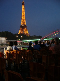 凱旋門からタクシーと思いやっと見つけ、 乗船乗まで地図見せても分からず、 地下鉄と1Km徒歩になる(Tさんゴメンナサイ!) ![]() セーヌ川のほとりからエッフェル塔を見る ここから(バトウ・ムッシュ)遊覧船に乗り込む PM9:00ごろでも薄明かりである。 |