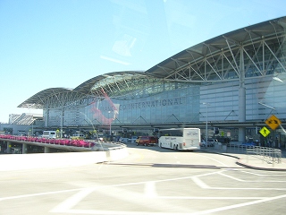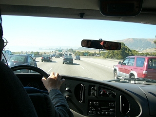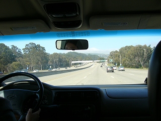 目を真っ赤にしてカルフォルニアに到着:二人だけのツアー! 入国は厳しいぞー!指紋と顔写真撮り尋問?! 靴も脱いで検査です(さすがに服は脱ぎませんでした) 市内観光のスタート。フリーウェイをバンバン走る!! 添乗員兼女性ドライバーで運転はちょびっと荒いかなぁ?! |