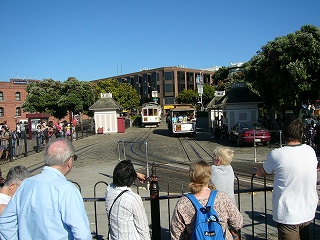 【ケーブルカー】フィッシャーマンズ・ワーフへ 乗るのに大変ですが運転手はすごく陽気です |