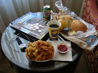 ![]() シーフード屋台で買う。なんと夕食なのです!! イカリングと思っていたら、ポテトリングだつた!7:30pm |