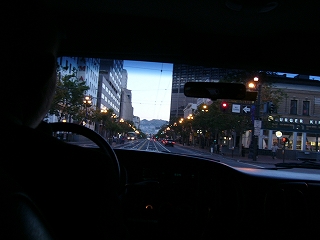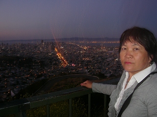 サンフランシスコ ナイトツアー 毎日出発 8:30pm - 10:30pm 前方二つの山がツインピークス・・ドライバーは毛のない鶴さん |