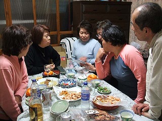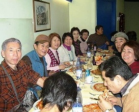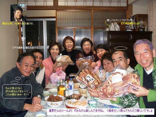 ![]() イタリア帰国一ヶ月後の『反 省 会』 星野さんは『海老せんべい』に変身して参加です。 |