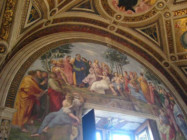 ![]() オオーなんときれい! 「ラファエロの間」の「パルナッソス山」 音楽と詩に関係する人物による「美」の寓意画(ぐういが)「別の物事に託して表現した画」だそうです。 |