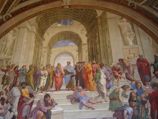 ![]() 「ラファエロの間」の 「アテネの学堂」プラトンがレオナルド、アリストテレスがミケランジェロをモデルにして描かれて有名です。 そのほかにもブラマンテ、ラファエロの自画像など、当時の芸術家、政治家などの有名人がたくさん描かれている。 |