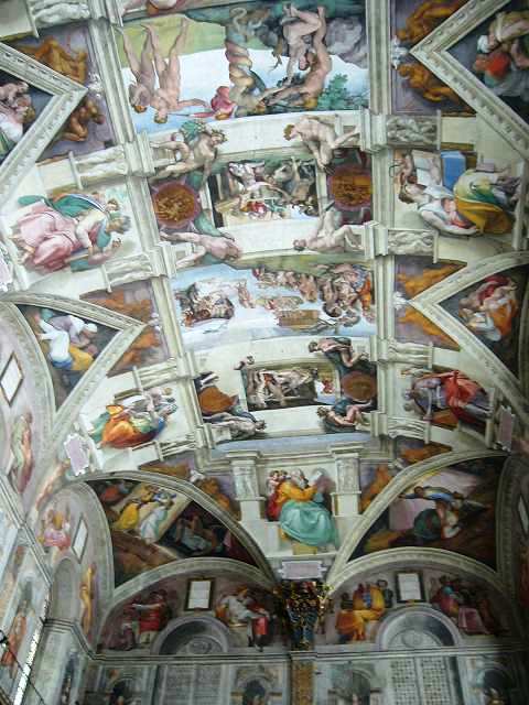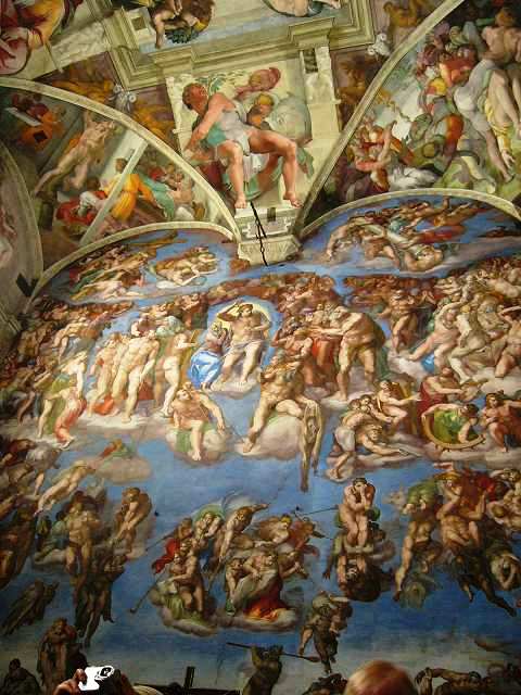 ![]() 「システィーナ礼拝堂の天井画」の『最後の審判』 ミケランジェロが60歳から6年の歳月を費やして完成させた。 高さ20mの天井に向き合って過酷な作業を強いられ、4年半後に、長さ約40m、幅約13mを完成。 このフレスコ画は、「旧約聖書」の「天地創造の物語」をテーマに描かれた。 見たかったので感激!感動!でーす。 |