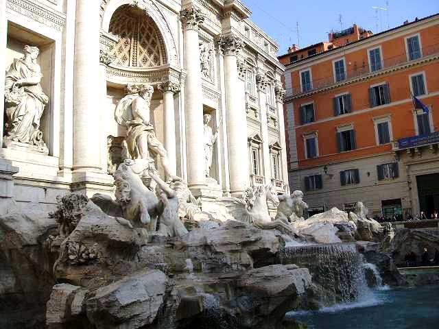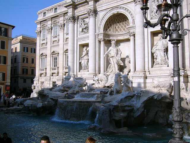 ![]() トレヴィの泉(Fontana di Trevi) 紀元前19年に建造され「アクア・ヴェルジネ(処女の水)」と呼ばれた水道の放出口。 ローマ帝国崩壊後の蛮族の侵入によって、他の水道同様、ここも破壊される。 |