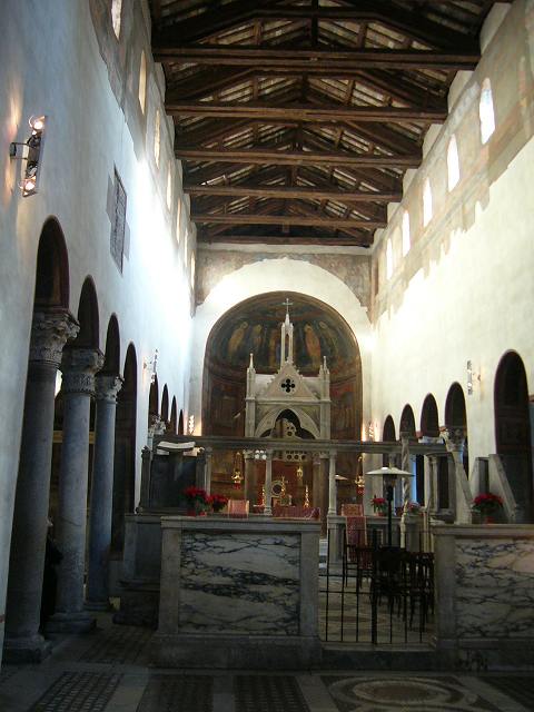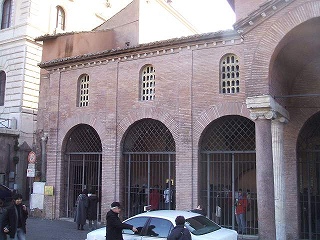 ![]() サンタ・マリア・イン・コスメディン教会 こじんまりとした三廊で、窓も壁の高いところにあるため、暗くひんやり。 真実の口で記念撮影して、横目で見るだけ?神秘的な雰囲気でした。 モザイクの床、司教座、主祭壇の天蓋 |