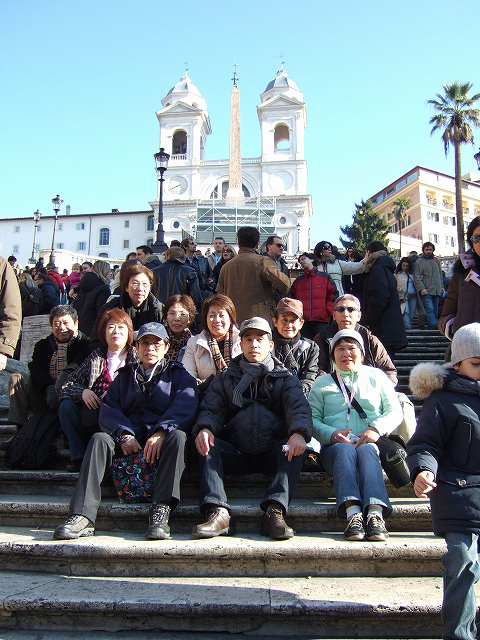 ![]() 半日自由行動を12人(+Hosino夫妻)で、『ローマの休日』観光スタートです。 オードリー・ヘップバーン『ローマの休日』のワンシーン:スペイン広場「スペイン階段」で、 後ろは「トリニタ・ディ・モンティ教会」 |