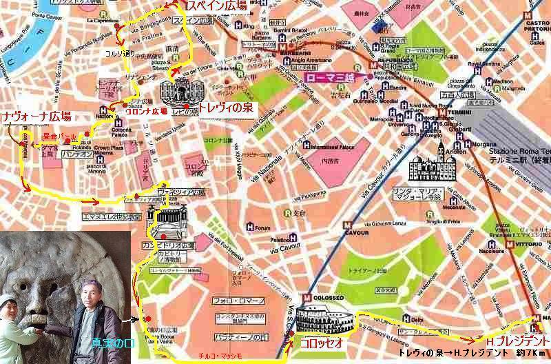 『ローマの休日』 ![]() トレヴィの泉からホテルまで歩いた道筋です(黄色) |