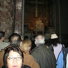 ![]() 入り口を入ると右側にあるミケランジェロの「ピエタ」 サインが入った唯一の作品。 十字架から降ろされ、聖母マリアに抱かれたキリストが・・・! |