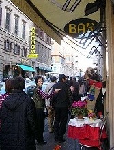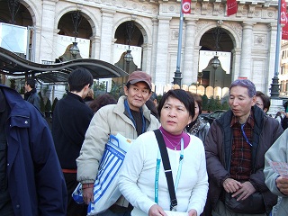 ![]() 「ローマ三越」前でホテルへのバス待ちで、Tさんの手には買い物の袋! |