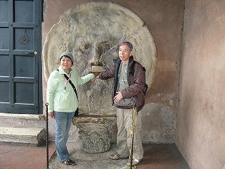 ![]() 「真実の口」は下水溝のフタだったとか? Toさん30分待っとれんので、外から記念写真撮り、 コロッセオの凱旋門で落ち合うことにして別れる。 |