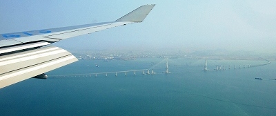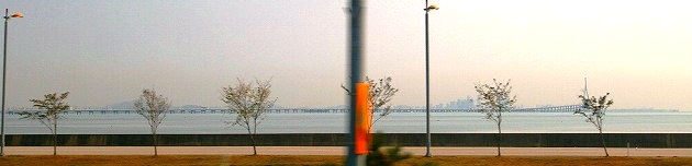 ![]() 長〜い橋が見えますが、飛行機から見えた橋だろうか? ラマダホテルの3人?を降ろし、手続きで15分程ロスタイムである。 |