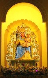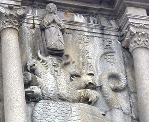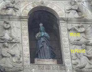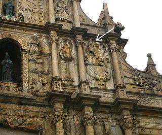 ![]() 長崎から幕府の弾圧を逃れて渡ってきた日本人キリシタンも建設に関わっていた。 マリア像の周りを取り巻く花の彫刻の菊は日本、牡丹は中国を表している。 |