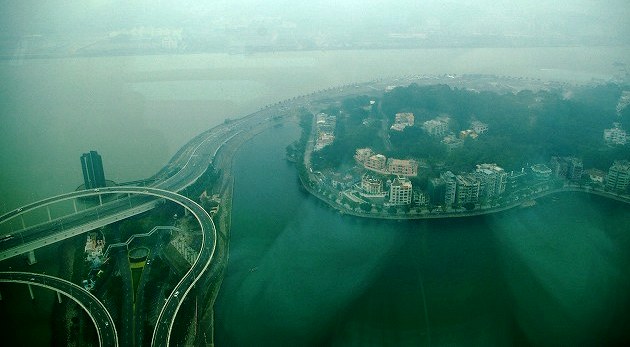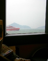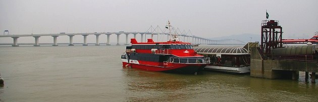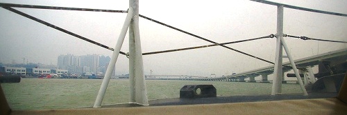 ![]() マカオに近づいた時に一等席の最前列で撮影させてもらう。島同士を結ぶ長い橋。 |
