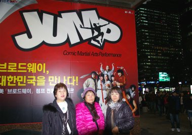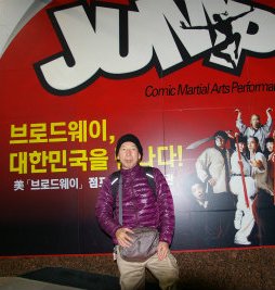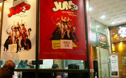![]() ![]() JUMP看板のハングルを読むと「ブロードウェー 大韓民国を 会う」かな? http://www.konest.com/data/spot_mise_detail.html?no=735 韓国の伝統武術であるテッキョンとテコンドー(日本の空手が起源)を中心とした武術と アクロバットなどの演技を組み合わせたコメディータッチのストーリー! |