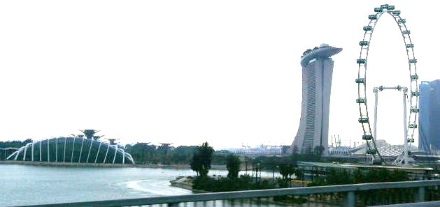 ![]() 建設中の植物園を見下ろす「マリーナベイ・サンズホテル」と「大観覧車」 車窓 |