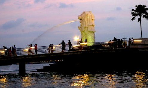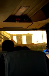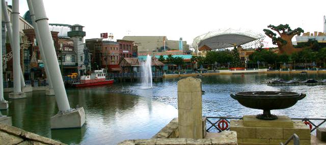 ![]() 左の海はシンガポール港で、正面にUSSが見えてきた(セントーサ島) |