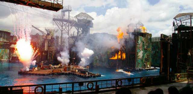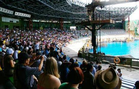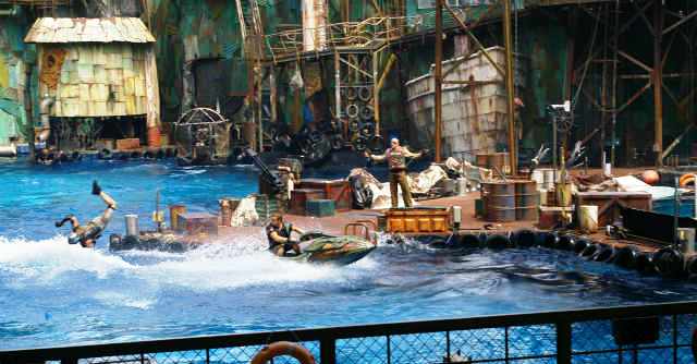 ![]() ジェットスキーの水しぶきが観客席まで飛んでくる。スタントマンもみごと。 |