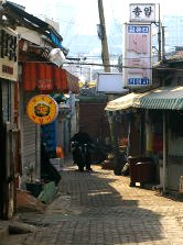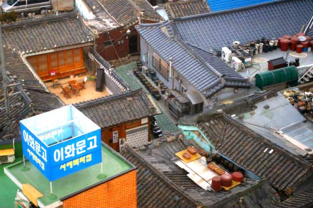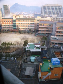 ![]() のんびり8:00に目をさまし、905号室の窓を見下ろすと韓屋が見えるではないか? |