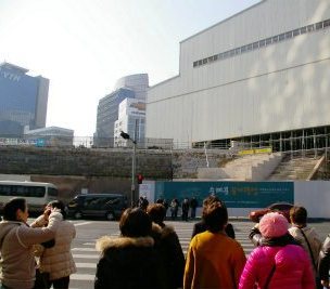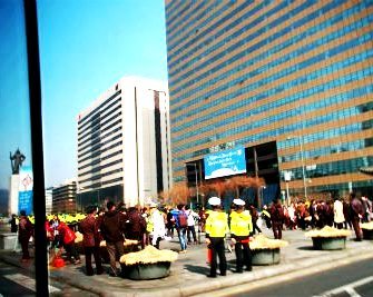 ![]() 左)集会は自由だそうです。韓・米軍事合同訓練があり、警察官が目立つ? 右)崇礼門(スンネムン)=南大門、残念なことに放火により 消失し、現在復元中。 |