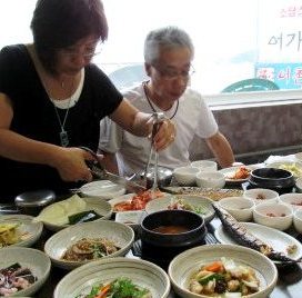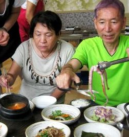 ![]() ![]() ![]() 本来はカニを食べに機張市場キジャンシジャンへ行く予定が、時間がかかるとの理由で中止(ガイドが行きたくない?) 軽い昼食を頼むと、龍宮寺近くの店に案内。 地元民の食堂の感じで、安いが味はちょっと!タコをハサミで切る。 |