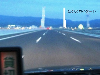 ![]() 関空到着後、荷物が遅く(我々が遅かった)ホテルのバスに乗れず、高額のTAXIに乗り込む。 空港から町に向かう連絡橋の先にそびえる不思議な一棟、予算が下りず幻のスカイゲートだ。 |