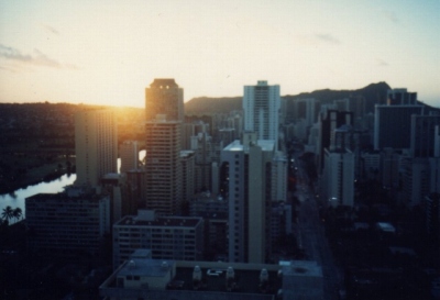 ![]() 部屋から見る日の出眺め、ちょっぴりリッチな気分に! 左にはワイキキの北側にある人工の運河。 |