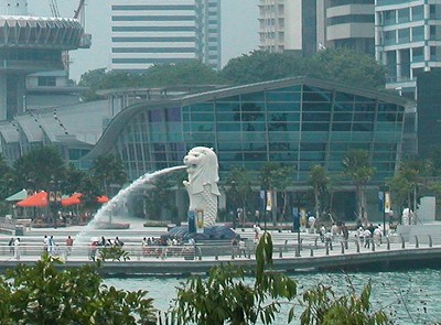 ![]() シンガポールの名物マーライオンをバックに、海の汚さにはガッカリです。 夜この一帯は男性のカップルでにぎやかだそうです。 |