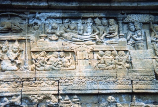 ![]() レリーフには仏陀の一生が描かれ、 それが回りに鮮明に残る。 |