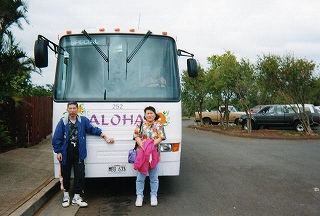 ![]() やっぱりハワイはALOHAだね! 空港までお迎えのバスです。 私の服装は普段のまんまです!(国内・海外・テニス) |