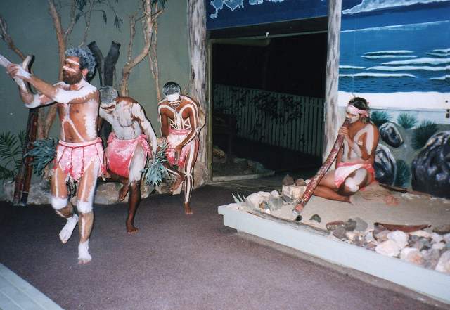 ![]() オーストラリア先住民のアボリジニの伝統的なアボリジナルダンスも迫力あり、 腹の奥にまで響く楽器?彼らのフェイスペインティングや踊りも体験してきた。 |
