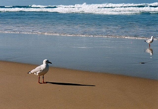 ![]() ゴールドコーストの海岸(どこまでも続く白い砂浜と青い海、42Kmの海岸線)の鳴き砂(歩くとキュッキュッキュッ) |