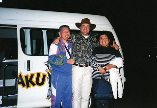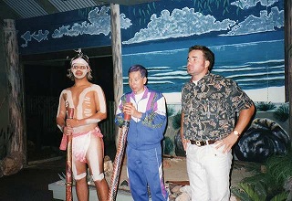 ![]() アボリジ二人と民族楽器を手にガイドさんと 吹いても音が出ない・・・ブぉー!と低い音が響く。 |