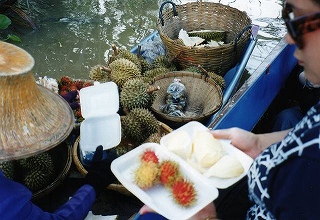 オバサン達が売りにくる 水上マーケットでドリアンを食べる! おみやげを ついつい買いたくなるが高い! |