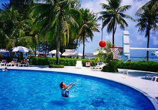 ホテルのビーチで、背後の花は「フレームツリー」:日本名「花炎樹」です。 |