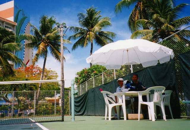 サイパンのテニスは暑いです!(ラケット持参) コート行く途中に、パパイアの木が沢山あり『熟した実』が落ちている・・・毎朝食べれて、美味しかったわ〜! |