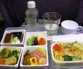 ![]() おいしそーう?機内食のメニュー(日本時間PM11:30頃) 私はサラダとケーキでほとんど食べない(時差ぼけ防止) |