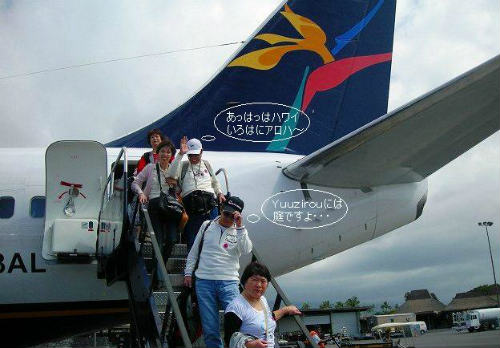 ![]() 元気に*ニコやかにタラップを降りてハワイ島(コナ空港)到着!30分のフライト |