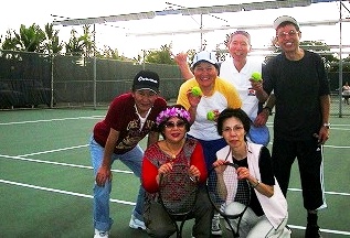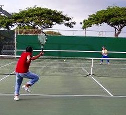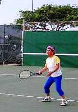 ![]() テニスコートは無料で、周りは公園で緑が一杯・・ 八重のハイビスカス テニスコートで記念写真も、けっこう暑かったが体ほぐれて楽しかったね! |