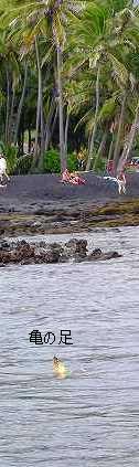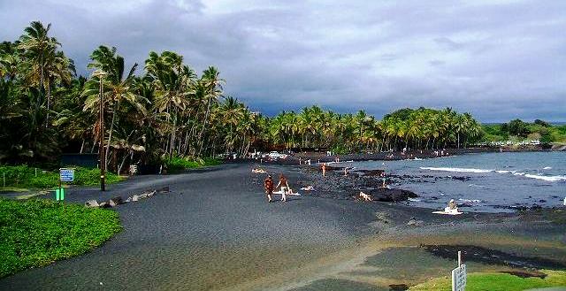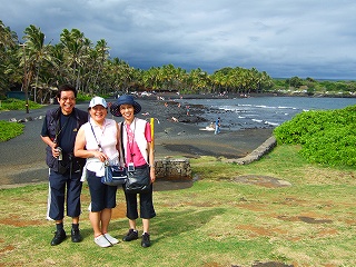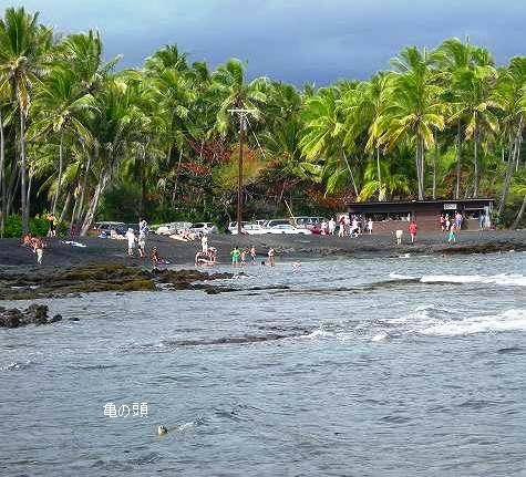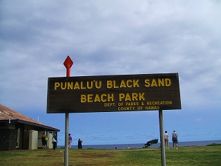 ![]() 《プナルウ・ビーチ》溶岩によって出来た黒砂海岸 アオウミガメの甲羅干しは見えなかった。 海の中を漂っていただけで、なかなか見つけれないです。 |