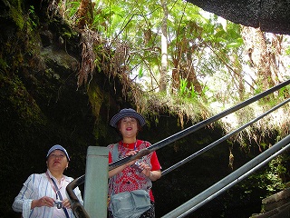 ![]() ![]() トンネルは薄気味悪ーい!直径は5m程かな、水滴が体にかかる。 壁面には床面と平行な線がある,マグマが通過してゆく時につけられたのか? |