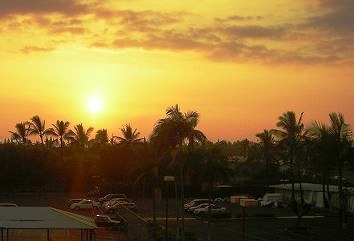 ![]() 6:20pm 朝焼けのホテル海辺は空気も澄んで、朝日が登るまでとても素晴らしい。 対岸にコナの中心街が見渡せる景色の良い桟橋と、町の後方に見えるフアラライ山2521m |