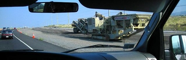 ![]() やっと撮れた写真?どおいった機械か解らないがガイドさんの説明を写真に収めた。 (ハワイの道路工事で使用するバラスは、掘れば溶岩なんで現場で砕いてバラスにして使用するんだそうな) |
