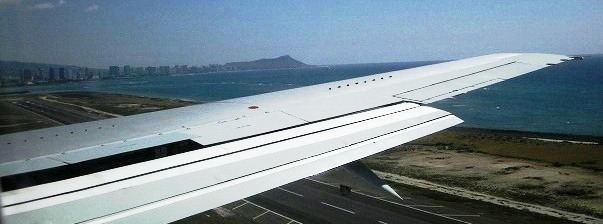 ![]() ワイキキのビル群が迫って、いよいよホノルル。着陸時にはエンジンカバーも開いて制動させるんだ! |