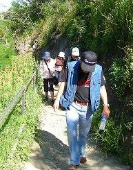 ![]() 登山口は、平坦で道幅もある舗装された道が続く。 笑顔で余裕のTakakoさん 自然の山道へと変わり、もう頭が下がってきた。 |