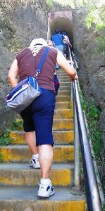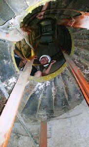 ![]() 最初の階段は76段、それを登ると長いトンネル.。二つ目の階段、心臓破りの99段へと続く。2003年に照明が設置された43段の螺旋階段 |