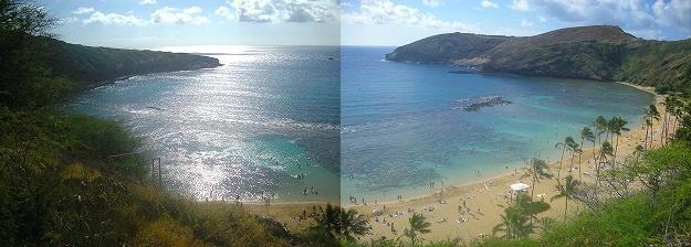 ![]() もともとクレーター(火口)であったものが、片側が沈降して見事な入り江となった(駐車場から) ハナウマのハナはハワイ語で湾を、ウマはコップなどを握るときの手の形を表している(確かに見えますね) |