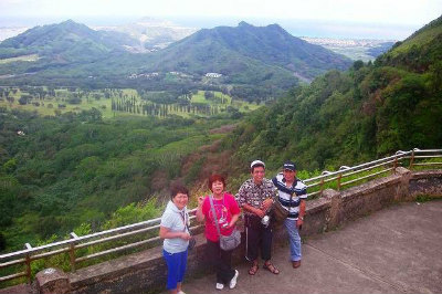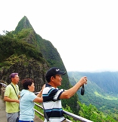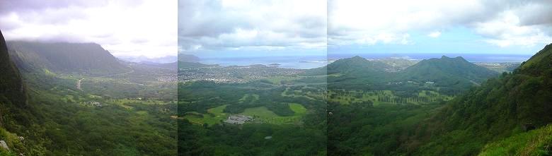 ![]() 《ヌアヌパリ》コオラウ山脈の途中にある断崖の上の展望台。 垂直に切り立った崖はおよそ900m。右にカイルア方面、左にノースショア方面を一望できる絶好のポイント。 |