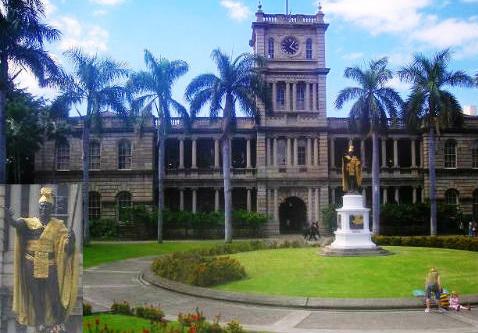 ![]() 《カメハメハ大王像》 官庁舎として使われたいた建物アリイオラニ・ハレの目の前に立っている。 二度と槍を使わないと言う平和の象徴として槍を左手に持ち、友好のジェスチャーとして右手を前方に延ばしている。 |